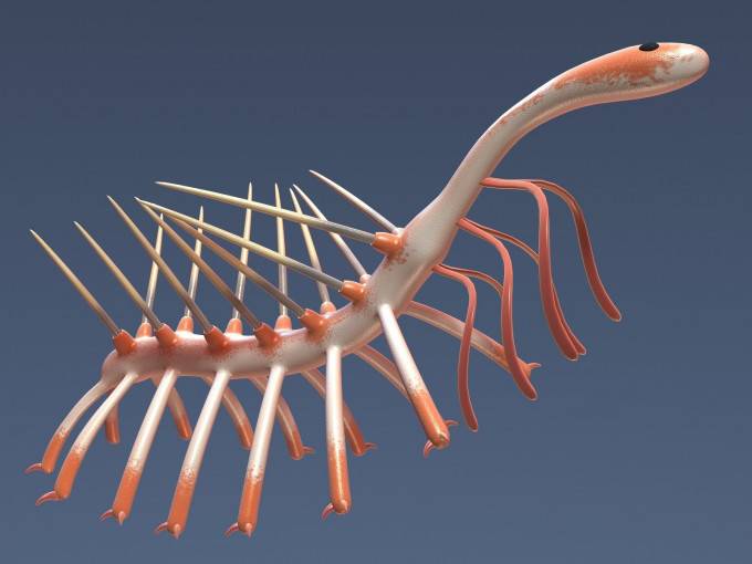 Niewielka Hallucigenia (5 mm - 3 cm), która żyła w kambrze, była cholernie dziwnym robakowatym bezkręgowcem. Miała 7 par nóg i 7 par kolczastych wyrostków, ale naukowców zainteresował przede wszystkim brak organów, które zazwyczaj znajdują się na głowie: oczu, czy otworu gębowego. W 2015 roku spojrzeli na to stworzenie pod mikroskopem elektronowym i zobaczyli nie tylko parę malutkich oczu, ale także usteczka z wianuszkiem zębów.