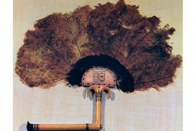 Blisko ciała faraona został odkryty wachlarz ze strusich piór. Oryginalnie składał się z długiej złotej rękojeści zwieńczonej półkolistą „dłonią”, która podtrzymywała 42 brązowe i białe pióra. Rozpadły się one dawno temu, ale ich historia została zapisana hieroglifami. Stąd wiemy, że pióra zostały zabrane strusiom schwytanym przez samego faraona podczas polowania na pustyni na wschód od Heliopolis (w pobliżu współczesnego Kairu). Wytłoczona scena przedstawia Tutenchamona wyruszającego swoim rydwanem na strusie oraz triumfalny powrót.