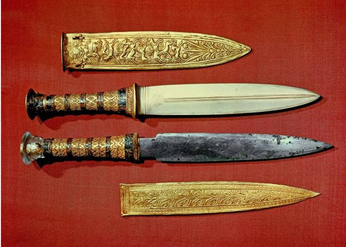 Howard Carter odkrył dwa sztylety w złotych pochwach, starannie zawinięte w bandaże mumii. Jeden miał złote ostrze, ale to ten drugi, z żelaza, był cenniejszy. Za życia Tutanchamona „żelazo z nieba”, jak je nazywano, było metalem bardzo rzadkim. Jak sama nazwa wskazuje, egipskie „żelazo z nieba” zostało prawie w całości pozyskane z meteorytów.
