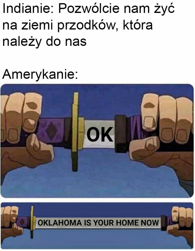 Mimo że w 1787 roku Kongres Stanów Zjednoczonych wydał ustawę, w której zapisano, że „ziemi Indian nie należy im odbierać bez ich zgody”, to w 1830 roku uchwalono ustawę o usunięciu rdzennych mieszkańców (Indian Removal Act). Na jej mocy wszystkie podbite plemiona indiańskie miały być przesiedlone na Terytorium Indiańskie – rozległy obszar na zachód od Missisipi (z okrojonego potem Terytorium powstała Oklahoma). Nie wolno tam było mieszkać białym, ale rządni ziemi biali siłą lub podstępem żenili się z Indiankami, by stać się członkami plemion. Plemiona, które stłoczono w rezerwatach, były często ze sobą skłócone, więc toczyły walki. Zatem Oklahoma nie stała się domem autochtonów, a więzieniem.