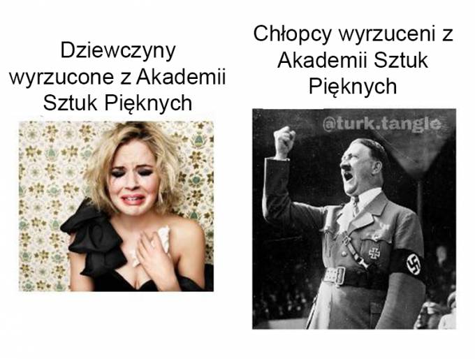 Mało sympatyczny pan z wąsikiem był wielkim amatorem malarstwa. Jako pejzażysta bezskutecznie próbował dostać się do Akademii Sztuk Pięknych w Wiedniu. Może gdyby go przyjęli, to zostawiłby politykę i nie wybuchłaby II wojna światowa? Kto wie (oczywiście winni są austriaccy profesorowie sztuki). Hitler posługiwał się akwarelami, ale nieco gorzej niż mapą świata. Resztę znacie.