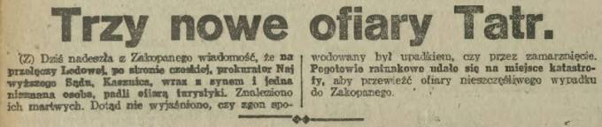 W całym kraju o tym mówiono. Od morza do samiuśkich Tater, gdzie 7 sierpnia 1925 roku wydarzyła się tajemnicza historia, która do dziś nie została wyjaśniona. Nagłówek "Ilustrowanego Kuryera Codziennego" krzyczał na pierwszej stronie: "Trzy nowe ofiary Tatr". Inne gazety z międzywojnia przekonywały, że musiało dojść do zbrodni. Sprawę komentował w swych listach do żony nawet Witkacy.