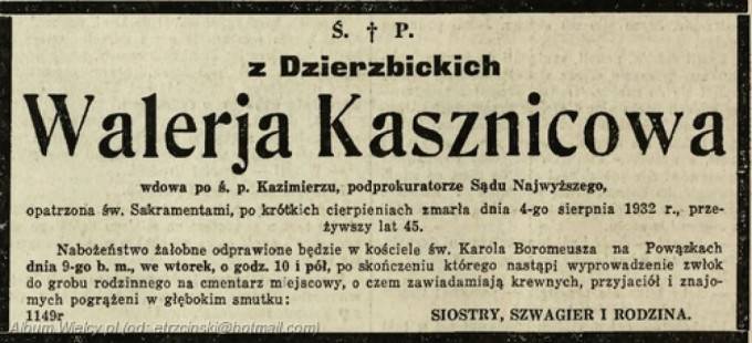 "Prokurator na chwilę odzyskał przytomność i zapytał: a gdzie Wacek?, poczem zamknął oczy i skonał" - relacjonuje dziennik "Czas" z 9 sierpnia 1925 roku. "Pani Kasznicowa wróciła do syna, lecz zastała już zimne jego zwłoki". Wasserberger miał na chwilę jeszcze wstać i przejść kilka kroków w dół - jednak upadł kalecząc się w rękę i głowę. Po chwili zmarł majacząc i wzywając swą matkę. Jak wynika z sekcji zwłok, podczas upadku złamał rękę.