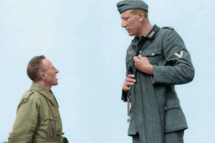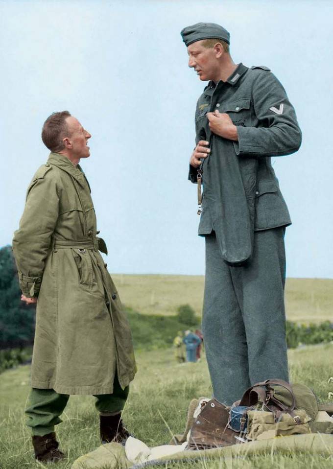Na poniższym zdjęciu Jakob rozmawia z Bobem Robertsem (160 cm wzrostu) z sił brytyjskich, po poddaniu się w pobliżu Calais we Francji w 1944 roku.
