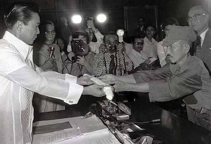 Onoda oddał filipińskim policjantom swój bezcenny karabin wz.99 Arisaka, 500 sztuk amunicji i kilka granatów, a następnie został aresztowany. Osobiście ułaskawił go prezydent Filipin Ferdynand Marcos. Onoda wręczył mu swój oficerski miecz na znak poddania, co wywołało niezadowolenie mieszkańców Lubang, którzy ucierpieli w wyniku działań bojowych podporucznika. Oskarżano go o 30 zabójstw i wiele kradzieży.